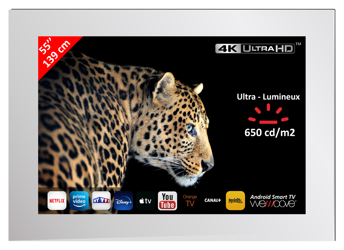 Espelho Smart Android TV 139 cm (55") à prova de água, sintonizador triplo HEVC, altifalantes invisíveis, ecrã ultra-brilhante, montagem embutida